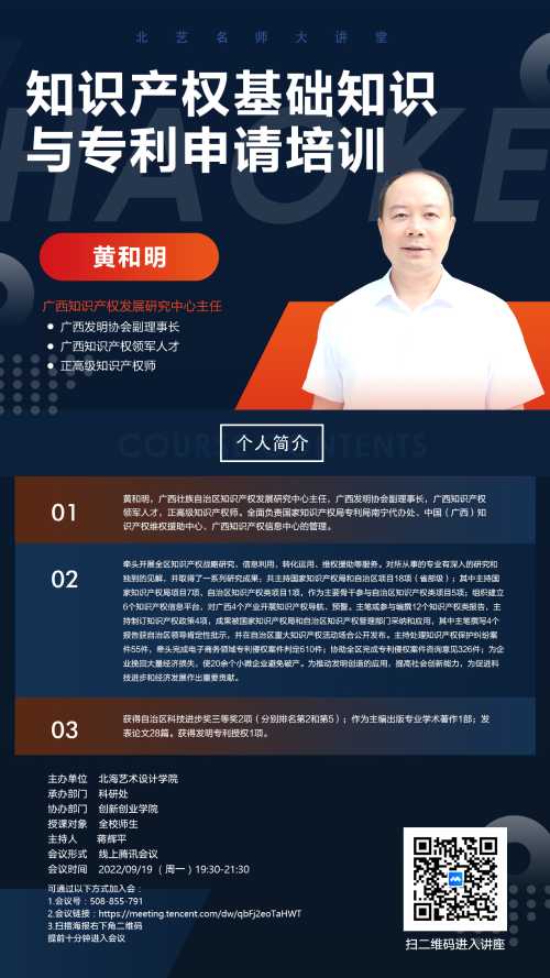黄和明,广西壮族自治区知识产权发展研究中心主任,广西发明协会副理事长,广西知识产权领军人才,正高级知识产权师。全面负责国家知识产权局专利局南宁代办处、中国(广西)知识产权维权援助中心、广西知识产权信息中心的管理。
