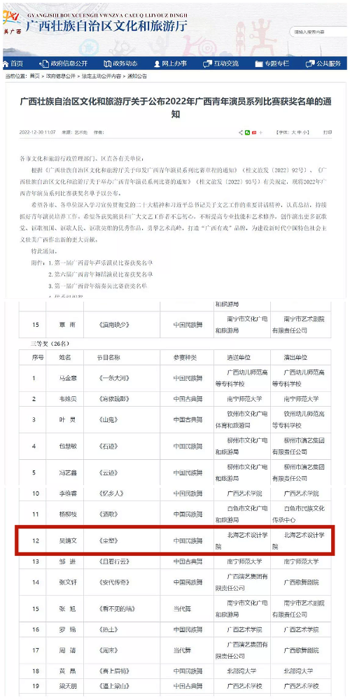 由自治区文化和旅游厅主办,广西文化产业集团有限公司承办的第六届广西青年舞蹈演员比赛决赛于2022年12月3日至12月8日在南宁民族大剧院开赛。我校两名舞蹈表演专业学生吴靖文和赖德彬从全区各级专业院团、艺术院校等88家单位、436个舞蹈作品、218名舞蹈演员中脱颖而出,成功进入决赛。其中学生吴靖文在决赛中取得了三等奖的优异成绩。