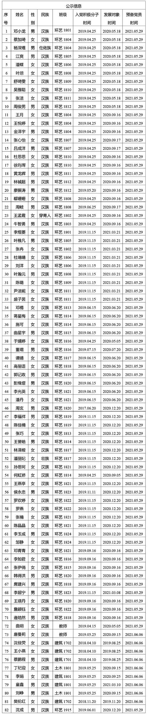 在征求党小组和党员、群众意见的基础上,经支部委员会审查,拟将邓小龙等82同志转为中共正式党员。根据发展党员工作有关要求,现将其有关情况公示如下,以下同志在预备期间表现良好。经党支部培养教育和考察,拟将邓小龙等82同志转为中共正式党员,并于近期召开支部大会讨论其转正问题。