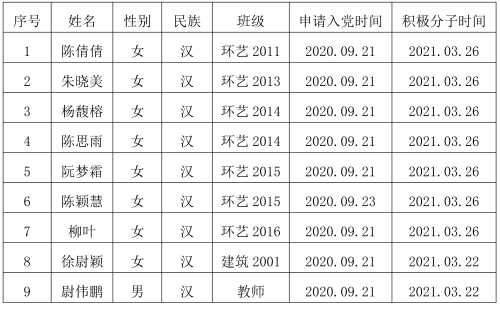 在征求党小组和党员、群众意见的基础上,经支部委员会审查,拟将朱晓美等9位同志列为发展对象人选。根据发展党员工作有关要求,现将其有关情况公示如下,经党支部培养教育和考察,该同志已基本具备党员条件,在征求培养联系人、党员和群众意见的基础上,经中共北海艺术设计学院建筑与环境艺术学院学生第二支部委员会2022年10月11日讨论同意列为发展对象人选。