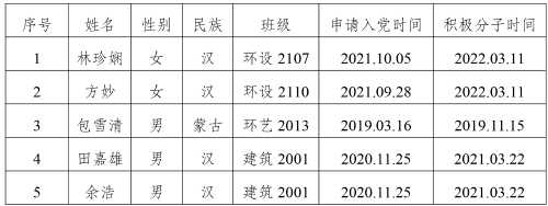 在征求党小组和党员、群众意见的基础上,经支部委员会审查,拟将林珍娴等5位同志列为发展对象人选。根据发展党员工作有关要求,现将其有关情况公示如下,经党支部培养教育和考察,该同志已基本具备党员条件,在征求培养联系人、党员和群众意见的基础上,经中共北海艺术设计学院建筑与环境艺术学院学生第二支部委员会2023年3月12日讨论同意列为发展对象人选。