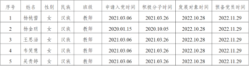 在征求党小组和党员、群众意见的基础上,经支部委员会审查,拟将杨桃蕾等5位同志转为中共正式党员。根据发展党员工作有关要求,现将其有关情况公示如下,同志在预备期间表现良好。经党支部培养教育和考察,拟将杨桃蕾等5位同志转为中共正式党员,并于近期召开支部大会讨论其转正问题。