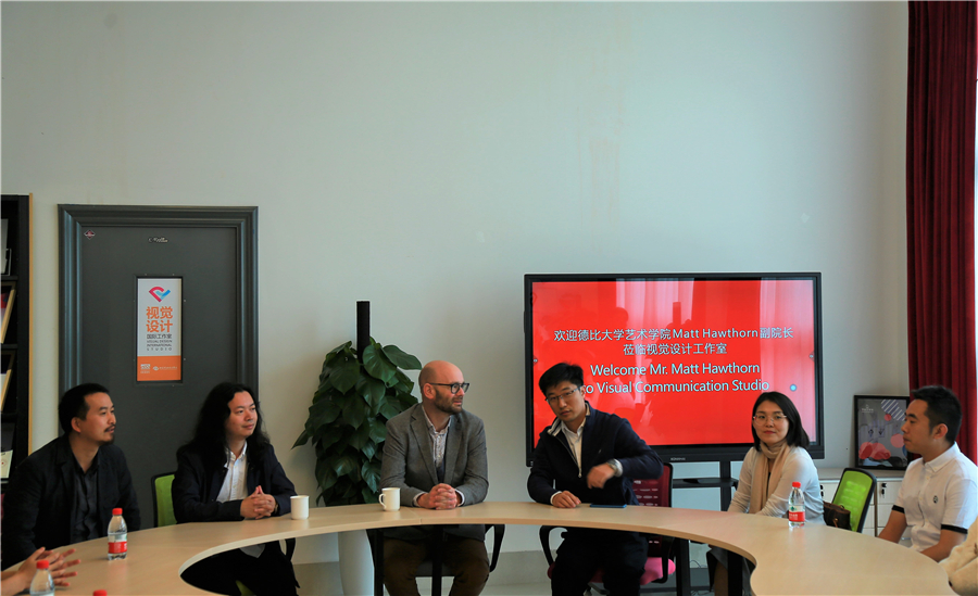 下午,Matt Hawthorn教授参观了设计学院的国际设计工作室,并与视觉传达设计专业师生开展交流会。设计学院李林平副院长为大家介绍了视觉系的部分师生实践项目,让Matt Hawthorn教授了解了中国文化在品牌设计中的应用,以及民族元素和现代设计的结合。他颇有兴趣地建议将德比大学设计系的学生作品与我校学生作品进行交互展示,让作品间的交流突破国界,不断拓宽学生的眼界,提高创新意识思维。