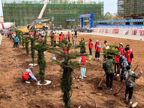 志愿者们怀揣着热情与期待,手持工具迅速投入热火朝天的植树活动中。挥锹挖坑,放苗入坑,小心扶正,填土夯实,提桶浇水,他们分工协作,默契配合,井然有序,合力完成每一道植树工序。