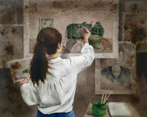 绘画 1906 班 谭波《画画的白衣女孩》106×76cm 水彩 指导教师:段凝