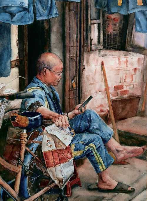 绘画 1906 班 麻镇显《忙碌之余》55×76cm 水彩 指导教师:段凝