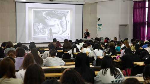 最后,王教授为学生分享了大型展会中的动态交互影像和沉浸式交互作品,作品通过控制和交互产生偶发性的动态影像,全程运用CG技术生成,打破学生对动态艺术作品表现的传统认知。