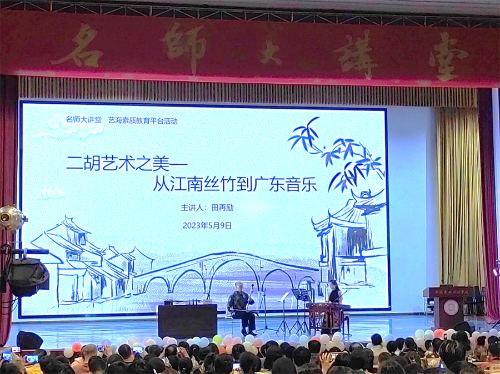 随着一曲耳熟能详的《步步高》响起,田教授现场展示了广东音乐的主奏乐器——高胡的艺术魅力。紧接着,江南丝竹八大代表作之一——《行街》细腻婉转的音响又飘进每位在场观众耳中。田教授结合现场演奏,详细讲解了广东音乐和江南丝竹的演奏形式、代表人物与代表作品。讲座妙趣横生、气氛热烈,受到了师生们的高度欢迎,加深了师生对江南丝竹、广东音乐等中国传统民族器乐音乐的认识,点燃了师生对二胡、高胡艺术的浓厚兴趣。