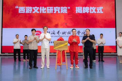 六小龄童、陈言启副局长与卢新华校长、彭仁副书记共同为西游文化研究院揭牌