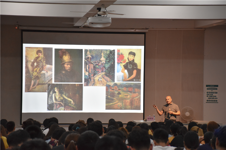 2020年11月18日晚7:30于我校西校区伦理楼107,广西大学艺术学院张明学教授为我校师生带来了一场题为《抗战时期美术作品人文与审美》的精彩讲座。本次讲座吸引众多师生到场聆听。讲座由我校教务处副处长武鹏程主持。