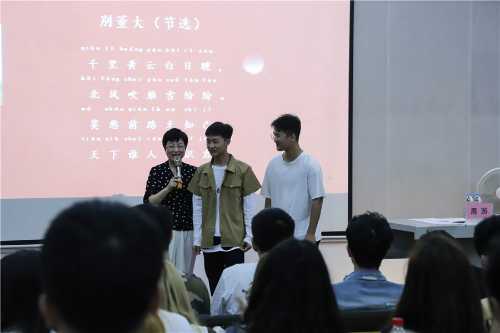 周游教授谈到朗诵作为一种以语言为载体的文艺形式,我们在朗诵诗歌时,首先要将自己带入到诗歌情景中,了解诗歌所要表达的情感,最后通过自己的理解和声音语言呈现出来。随后他邀请同学上台朗诵诗歌,指出其中存在的不足以及学习方法和方向,在愉快的互动中将诗歌的情感导入方法传达给同学们,现场同学们受益匪浅。