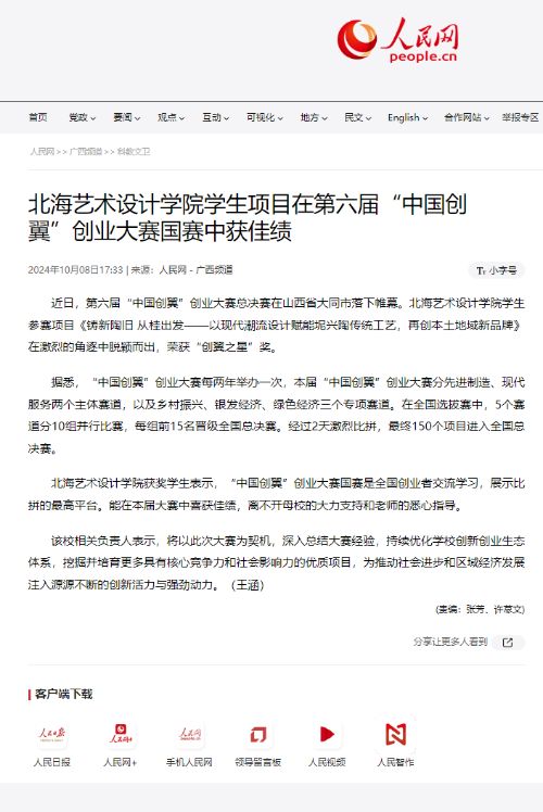 人民网:北海艺术设计学院学生项目在第六届“中国创翼”创业大赛国赛中获佳绩