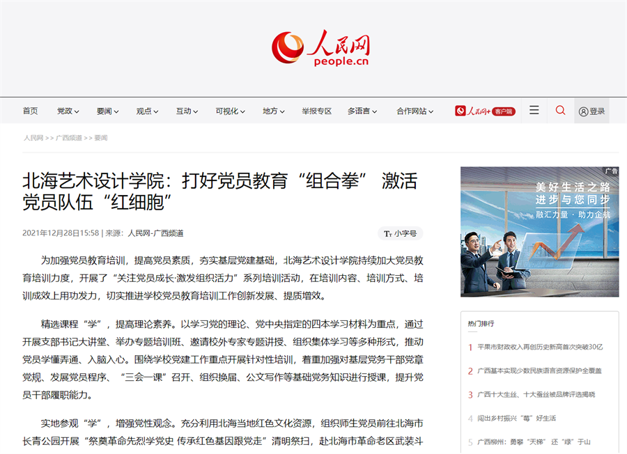 2021年12月28日,人民网以《北海艺术设计学院:打好党员教育“组合拳” 激活党员队伍“红细胞”》为题,关注报道了我校开展的“关注党员成长·激发组织活力”系列培训活动。学校持续加大党员教育培训力度,坚持把党员教育培训工作贯穿到党建工作的全过程,打造“立体化”教育培训体系,不断强化党员队伍力量。