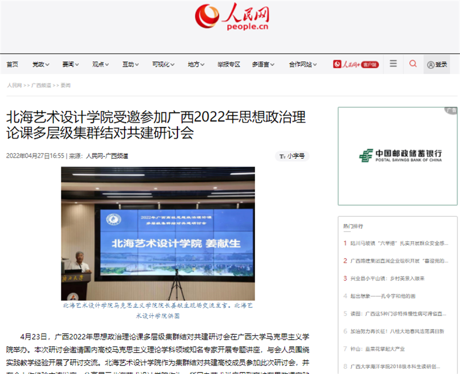 4月27日,人民网以《北海艺术设计学院受邀参加广西2022年思想政治理论课多层级集群结对共建研讨会》为题,报道我校在广西2022年思想政治理论课多层级集群结对共建研讨会上的经验分享。学校应邀参与此次研讨会,进一步加强了与各大高校之间在思政课实践教学方面的往来交流,学习优秀实践方案,为后续独立开设系统化、规范化、多元化的思政课实践课程积累经验。