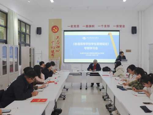 12月27日下午17:00,我院在西校区行政楼103组织全体教师集中专题学习《普通高等学校学生管理规定》(教育部令第41号),学习会由我院副院长罗秋梅主讲。