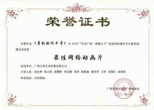 《勇敢的阿牛哥》2020“壮美广西-网播天下”原创网络视听节目推优展最佳网络动画片奖