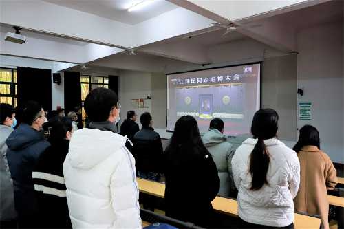 当天上午,伦理楼107现场庄严肃穆,10点整,江泽民同志追悼大会开始,全体人员向江泽民同志默哀3分钟,现场师生神情凝重、肃立默哀,深切悼念江泽民同志,寄托无限哀思,表达了对江泽民同志的崇高敬意和深切缅怀。默哀毕,全场高唱国歌后,认真聆听了习近平总书记所作的悼词,收听收看过程中,全体参会人员全程肃立,共同缅怀江泽民同志的光辉业绩、杰出理论贡献、优秀品格和高尚风范。