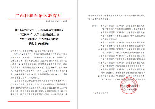 近日,广西壮族自治区教育厅发文公布了第九届中国国际“互联网+”大学生创新创业大赛“数广集团杯”广西赛区选拔赛获奖名单,我校斩获奖项共17项,其中,项目《惊喜八桂与“坭”同行》斩获自治区级金奖,其它晋级区赛的16个项目荣获自治区级铜奖。