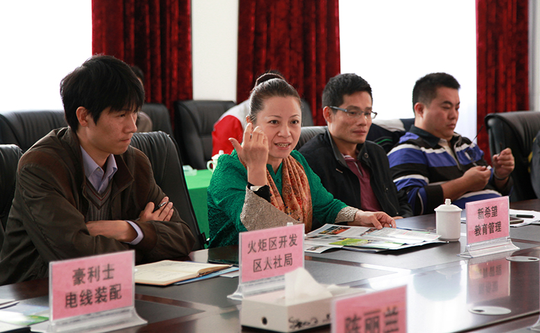 洽谈会上,企业代表认真听取了学院办学情况和校企合作意愿。中山市火炬开发区人社局孙庆森副局长介绍了火炬开发区的产业布局和人才需求情况。企业代表也相继发言介绍其人力资源需求及与院校合作的具体设法。围绕企业人才需求与院校学生培养对接、企业与学校协同创新培养技能人才等议题进行探讨并初步达成合作意愿。