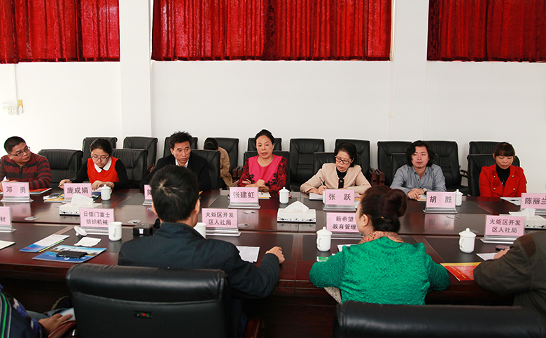 2014年11月14日,在广东省中山市火炬开发区人社局带领下,中山广盛运动器材有限公司、豪利士电线装配有限公司、立信门富士纺织机械有限公司、纬创资通有限公司、中山市新希望教育管理有限公司等7家企业单位代表来到我院考察办学情况并就深化校企合作进行洽谈。学院常务副院长张建虹、副院长张跃、设计学院常务副院长胡胜、动画学院常务副院长陶立阳及相关处室负责人参会。