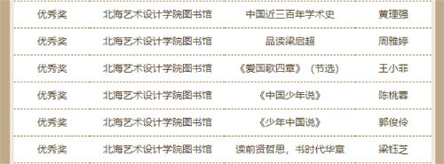 近日,由天津市全民阅读活动办公室、天津高等学校图书情报工作委员会、江苏省高等学校图书情报工作委员会主办的“品读梁启超 阅读创作大赛”的活动线上发布了获奖名单。我校学生作品征文类获得二等奖1名、优秀奖2名;书画类获得一等奖1名、三等奖2名、优秀奖6名;视频类获得一等奖1项、二等奖1项、三等奖4项、优秀奖5项。我校图书馆被评为“经典推广先进单位”“优秀组织单位奖”,学校教师喻广林、熊东等获优秀指导老师奖。
