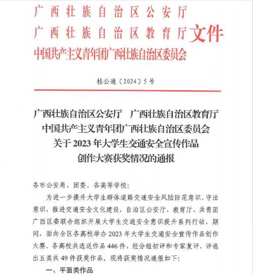 据悉,本次大赛由自治区公安厅、教育厅、共青团广西区委联合组织,旨在增强大学生道路交通安全宣传教育工作的针对性、实效性,着力提升大学生群体的道路交通安全风险防范意识、守法意识,推进交通安全文化建设工作。期间,面向全区各高校举办2023年大学生交通安全宣传作品创作大赛。各高校共选送作品446件,经分组初评和专家复评,评选出五类共49件获奖作品。