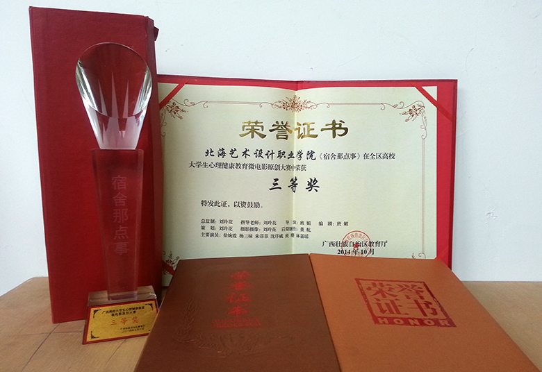 今年5月份,全区举行了高校大学生心理健康教育微电影原创大赛。在院领导的关怀下,由学生工作处、大学生心理咨询中心和心理社组织策划的作品《宿舍那点事》在全区61所高校133部参赛作品中脱颖而出,获得了全区高校大学生心理健康教育微电影原创大赛三等奖和剧本三等奖,学院心理咨询中心刘玲花老师获大赛作品优秀指导老师,学工处班媚老师获编剧三等奖。