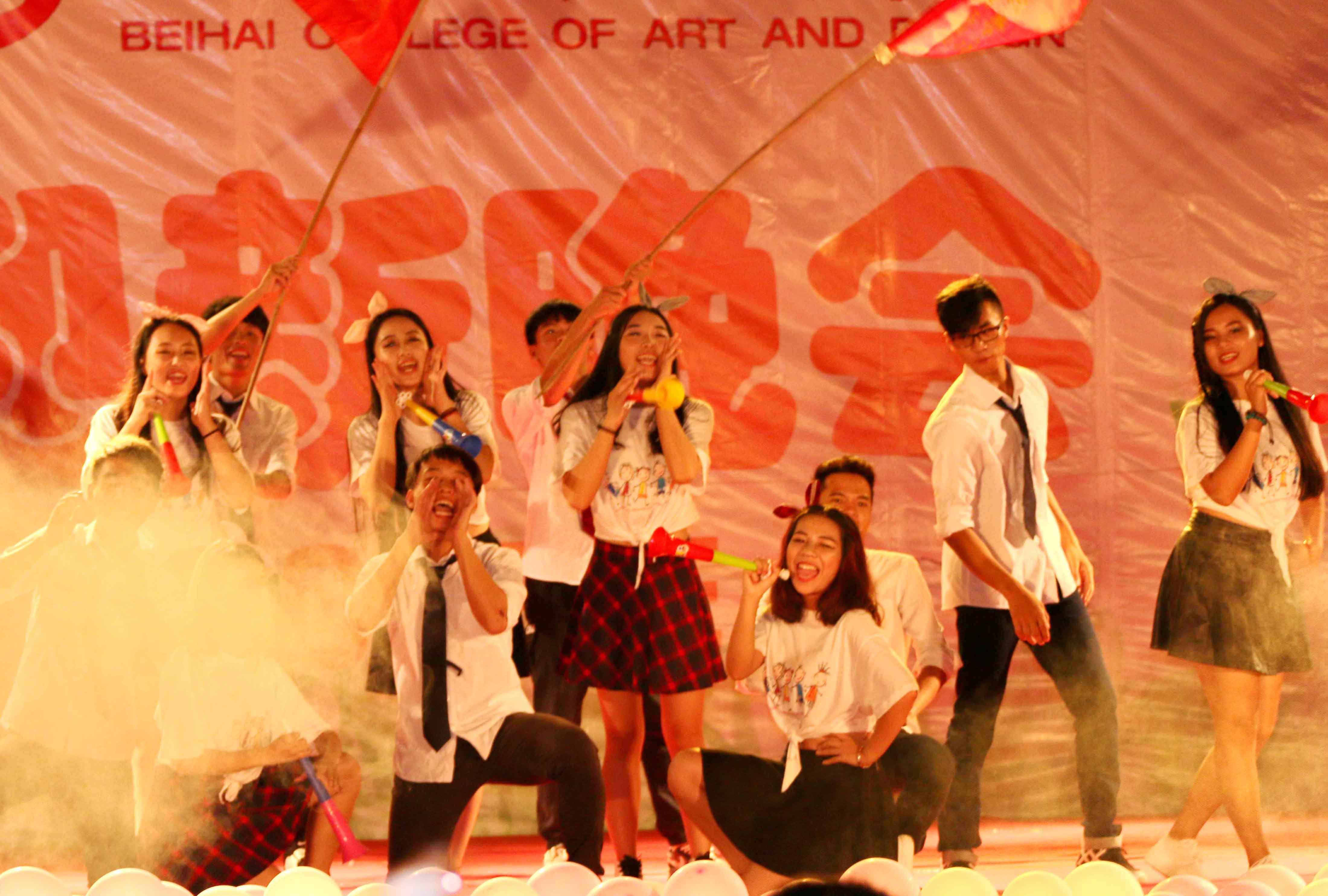 当晚,现场灯火璀璨、人头攒动。随着强劲的音乐响起,晚会在我院舞蹈团演员激情的开场舞《欢迎新同学》中拉开了帷幕,精彩的节目为观众呈现了丰盛的视听盛宴。来自15级班主任老师的诗朗诵《相逢是首歌》将晚会推向了第一个高潮,声情并茂的朗诵是班主任老师对学生们爱的呼唤;大二学长的《春天里》唱出了北艺学子不断追求梦想的渴望;环艺本科1513班的民族舞《追梦》激扬着青春的风采;艺教1501班《祖国之恋》的表演者仿佛是一群水的精灵,把自然移上了舞台陶醉了人心;街舞社动感的《dancing for you》,舞出了对生活的热爱,给观众带来了强烈的视觉冲击和听觉震撼。整场晚会精彩不断,高潮迭起,赢得台下阵阵掌声,欢呼声一浪高过一浪。15级动漫专业学生的合唱《爱我中华》为本场晚会划上了圆满的句号,歌声中饱含着同学铿锵自信和对祖国的无限热爱,绽放着青春与梦想的光芒。
