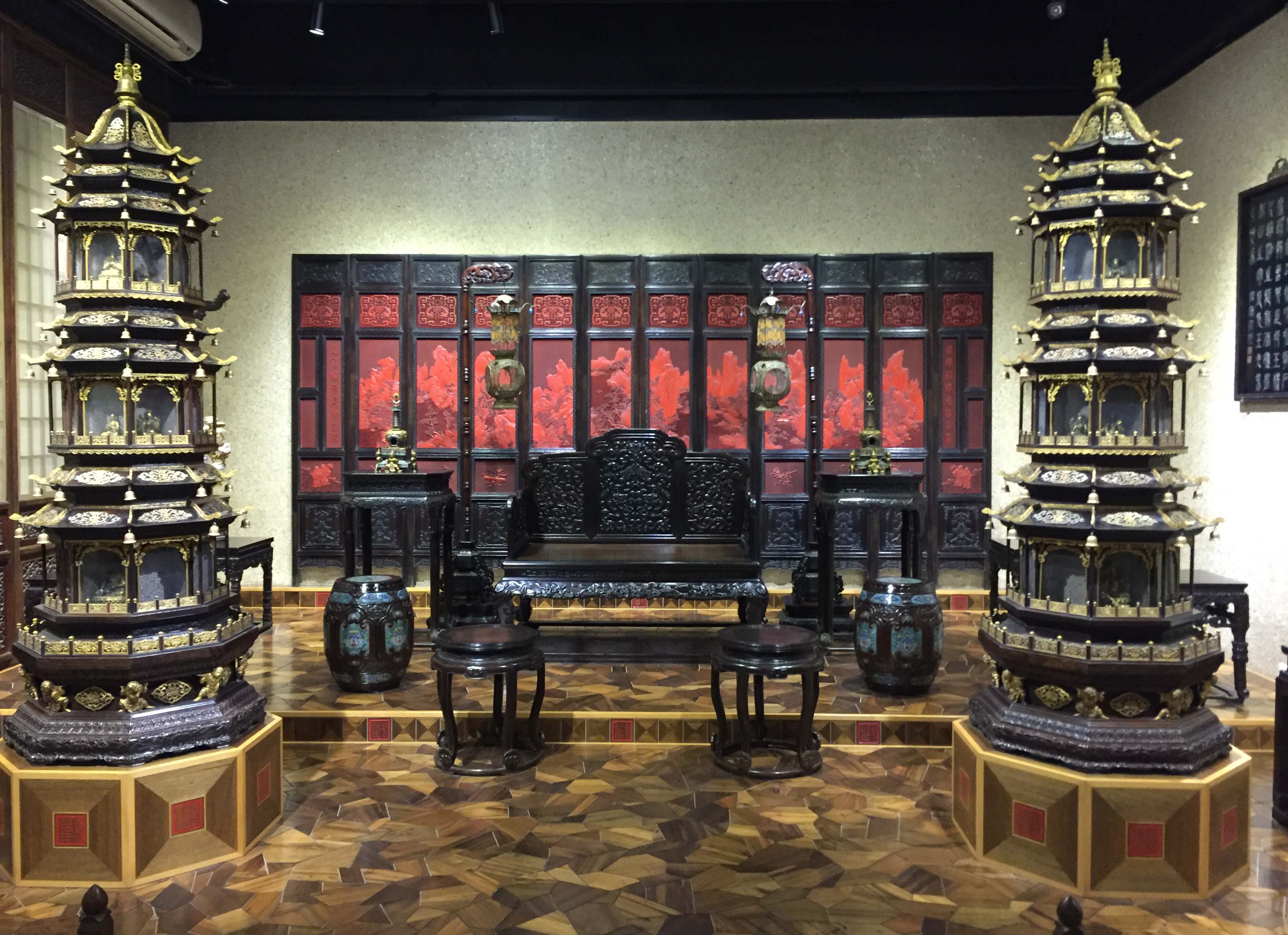 家具馆里陈列了中式家具,每件家具再配以当时的摆置形式,一个活生生的历史场景就呈现在眼前,行走其中,竟有穿越古今之感。明朝家具的典雅,清朝家具的华丽,一览无余。