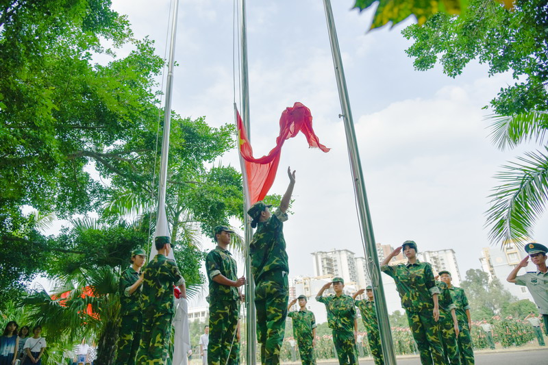 庄严的升国旗、升校旗仪式拉开了军训汇操表演的帷幕,来自2016级本科新生的37个受训方队,以饱满的热情、挺拔的军姿迎接学院领导老师的检阅。各连队通过行进间分列式齐步走、跑步走等预定训练科目的展演,向全校师生展示了他们历经16天刻苦训练的成果。分列式中,同学们精神抖擞,步伐整齐、铿锵有力,口号响亮,以饱满的精神、高昂的情绪书写着青春的斗志,彰显着朝气蓬勃、团结向上的精神风貌,搏得了在场领导和观众热烈的掌声和赞扬。