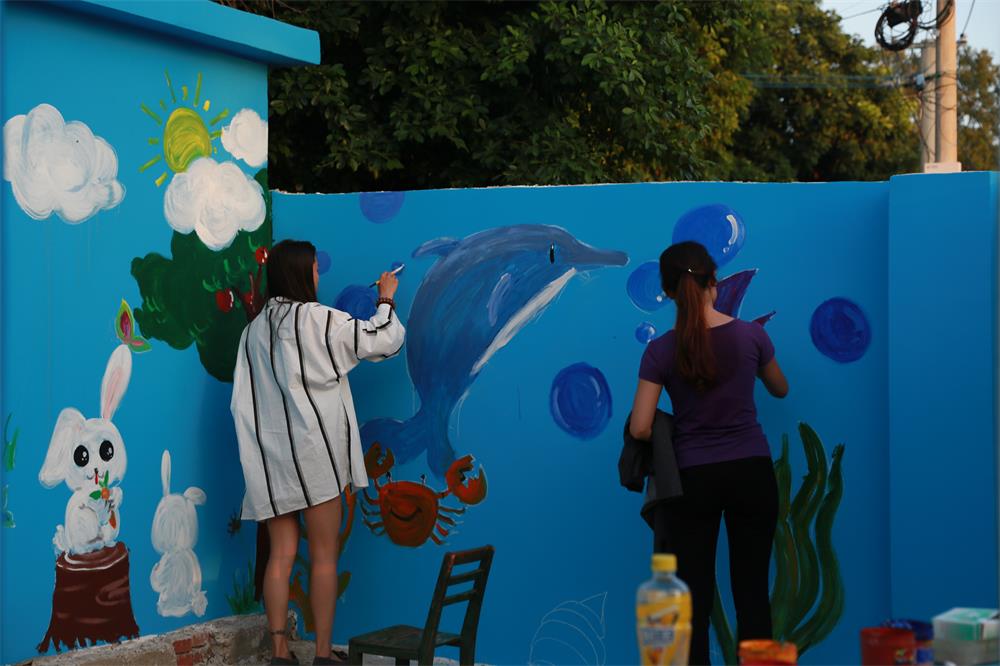 写生期间,童心幼儿园园长通过岛民联系到正在涠洲岛进行写生活动的动画学院常务副院长陶立阳,希望能给予幼儿园的美术老师一些绘画上的指导,并帮助他们美化校园。利用休息时间,陶院长带领部分专业课教师以及数字媒体专业的学生们来到童心幼儿园,开展帮扶活动。