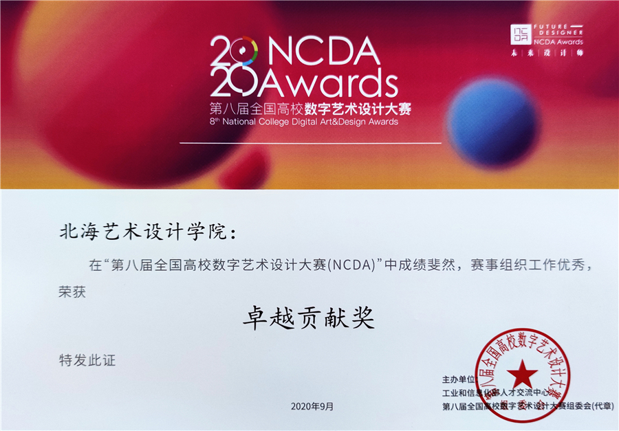 2020年11月14日,“第八届艺术设计教育研讨会暨第八届全国高校数字艺术设计大赛(NCDA)颁奖典礼”在历史文化名城嘉兴市隆重举行。在此次大赛中,我校表现突出,共获得一等奖四项、二等奖八项、三等奖八项、优秀奖两项,另外,我校赛事组织工作优秀,荣获卓越贡献奖。美术学院副院长唐海老师代表我校参加了颁奖典礼。