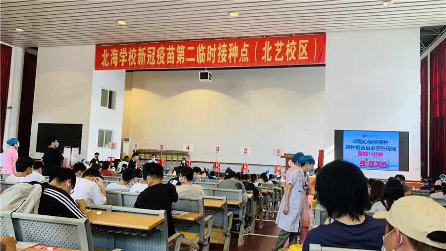 根据自治区、北海市的统一部署要求,推动党史学习教育走深走实,把“学党史”和“办实事”紧密结合,根据国家和自治区重点行业人群新冠病毒疫苗接种工作要求,我校强化管理,全面统筹部署,联合新冠病毒疫苗接种工作对接单位北海市妇幼保健院,组织全校师生在我校预防接种临时接种点——西校区大礼堂进行新冠病毒疫苗第一剂次接种,进一步筑牢我校师生免疫屏障,保障师生生命安全与身体健康。