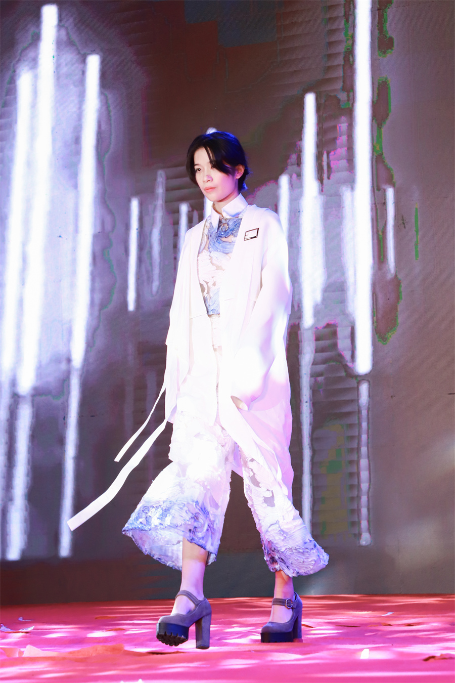 模特社的走秀表演《盛世新貌》,同学们通过独特的手工艺和剪裁方式,结合现代艺术和民族文化,赋予服装动人魅力,投射了中国当代社会的盛世繁华,成为全场焦点。