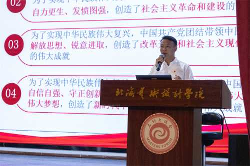 第三党总支书记孙永辉结合学院特点,以学院与北海市委网信办合作的微电影《Hello!BeiHai~你好!北海》作为开场,为同学们讲述中国共产党自建立以来经历的种种磨难以及做出的一系列重要决策,同时对党员标准和入党的基本条件等问题进行了深层次的阐释,告诫同学们要坚持共产主义远大理想,加强政治理论学习,从身边点滴做起。