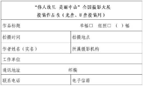 投稿作品以光盘(CD—R或DVD—R)、U盘存储形式邮寄至:北京市东城区东四十二条48号 中国摄影报社活动项目部首届中国·中山郑景康影像双年展:“伟人故里 美丽中山”全国摄影大展办公室收(100007)投稿热线:010—6525-1661。