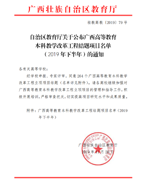 自治区教育厅关于公布2019年度 广西高等教育本科教学改革工程结题项目名单(2019年下半年)的通知