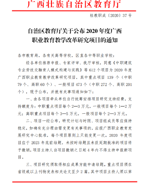 自治区教育厅关于公布2020年度 广西职业教育教学改革研究项目的通知