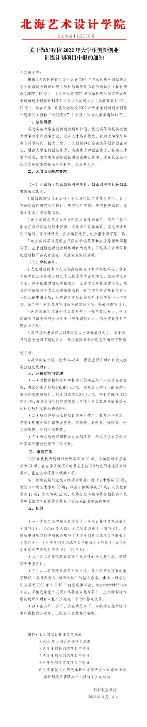 北艺创新〔2022〕6 号关于做好我校2022年大学生创新创业训练计划项目申报的通知