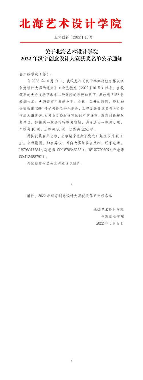北艺创新〔2022〕13号关于北海艺术设计学院2022年汉字创意设计大赛获奖名单公示通知