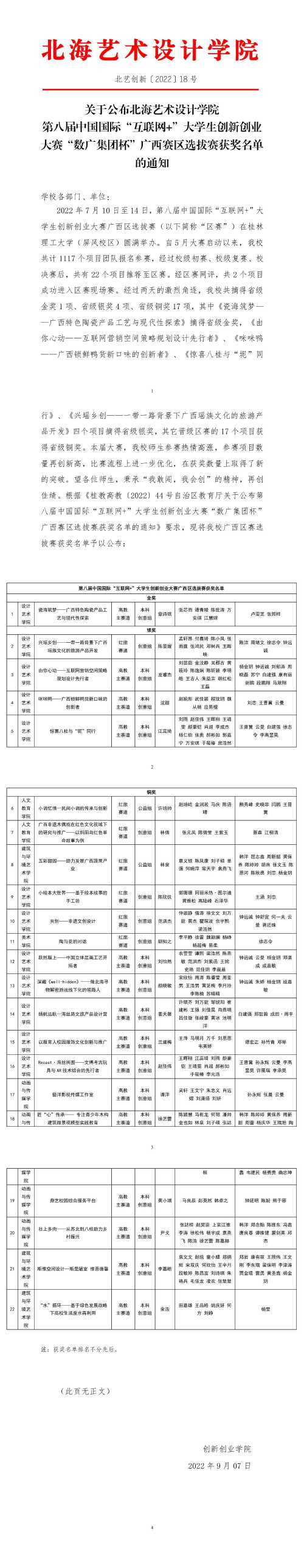 北艺创新〔2022〕18号关于公布北海艺术设计学院第八届中国国际“互联网+”大学生创新创业大赛“数广集团杯”广西赛区选拔赛获奖名单的通知