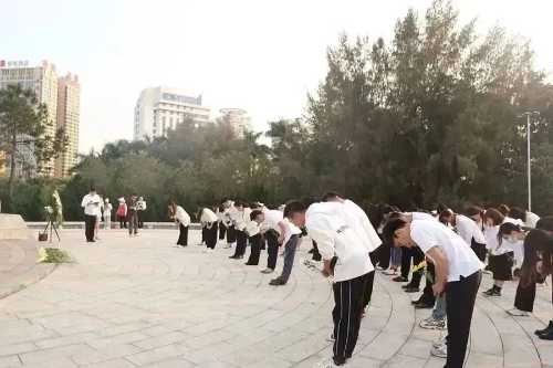 伴随着肃穆庄重的哀乐,全体代表人员面向烈士纪念碑缓步上前,轻轻把鲜花敬献在烈士纪念碑前,鞠躬致敬,静默缅怀。