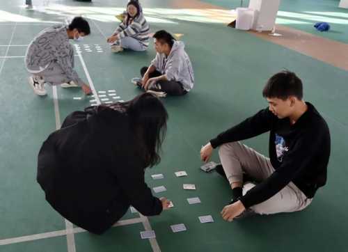 分组完毕后,活动正式开始了!!活动的第一个项目是“达芬奇密码”,裁判将纸牌的背面平铺地面,由组员接力跑向裁判,按数字大小的顺序翻动纸牌,翻完停止计时。