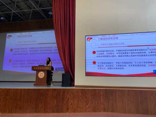 讲座开始,岳莹副书记从“了解党的百年历史”、“弘扬伟大建党精神”、“如何以实际行动争取早日入党”等六个方面为同学们做详细解读。首先,从党的百年历史、主要成就和历史任务等基本内容,结合习近平新时代中国特色社会主义思想的内容,使同学们对中国共产党有更深入的了解;随后,带领同学们学习了“时代楷模”、“七一勋章”获得者黄文秀的先进事迹,号召同学们学习她的崇高品质,让青春奋斗与民族振兴同频共振;最后,岳莹副书记详细讲述了入党程序、发展党员的标准等内容,并告诫广大学生要努力学习文化知识,提升学习能力,践行为人民服务的宗旨,从身边点滴做起,用实际行动争取早日入党。
