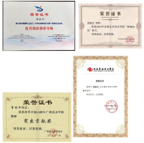 诲人不倦,潜心教学十八载。李林平老师无论处于教师职业生涯的任何阶段都秉持初心,奋战在一线。以教学为源点,不断更新育人理念和深耕教育规律,循序渐进、厚积薄发;以身为范,擅于引导学生成长,指导学生积极参与实践。他辅导学生参加的中国国际“互联网+”大学生创新创业大赛,各级赛事获奖共计10项:全国银奖1项、铜奖1项;广西赛区金奖2项、银奖2项、铜奖4项。辅导参加的全国大学生广告艺术大赛,各级获奖总计45项:全国二等奖4项、三等奖3项;广西赛区一等奖10项、二等奖5项、三等奖23项。李林平老师在教学、辅导上的优异表现,也收获了多项奖项或荣誉,如:中国国际“互联网+”大学生创新创业大赛广西赛区“优秀创新创业导师”、全国大学生广告艺术大赛“优秀指导教师”、时报金犊奖“优秀指导教师”、中国大学生广告艺术节学院奖“优秀指导教师”、改革开放40周年广西民办学校教师“突出贡献奖”以及北海艺术设计学院优秀教师、教学名师、师德标兵等。
