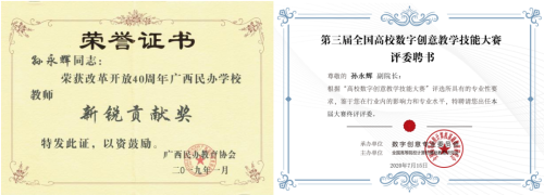 在教学上,孙永辉老师擅用项目教学法,以赛促教;营造教学相长的研究氛围,做学生的良师益友。近些年主持和参与的各级各类教改共计18项。例如:2019年,主持完成广西高等教育本科教学改革工程项目《基于“产教融合”数字媒体艺术专业建设与改革的实践研究》,项目编号2019JGA374。参与的课题有17项,如2018年,参与新世纪广西高等教育教学改革工程项目《基于项目驱动的三维动画类课程教学模式创新与研究》2021年,参与广西高等教育本科教学改革工程重点项目《新文科语境下动画项目创作课程改革与探索》,项目编号2021JGZ177。正因为勤劳的付出,积极实践、乐于辅导学生,也让他在教学方面荣获了多次奖项。如:2021年,指导的创新创业项目《重锤科技—全球将人工智能算法应用在声学软件领域的开创者》获第七届中国国际互联网+大学生创新创业大赛国赛银奖、第七届中国国际互联网+大学生创新创业大赛省赛金奖、最具有商业价值奖。2018年,孙永辉老师获改革开放40周年广西民办学校教师“突出贡献奖”;2019年,被评为北海艺术设计学院优秀教师;2020年,荣获师德标兵称号。
