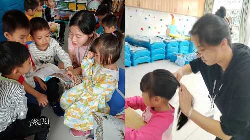 见习生迎接小朋友入园 见习生协助保育老师拿早餐