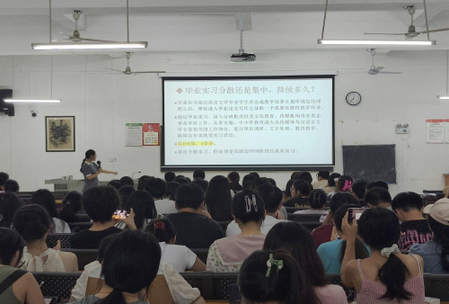 5月24日晚,汉语言文学教研室组织2021级学生在学校东校区觉悟楼106召开2025届汉语言文学专业本科生上京工作专业指导会。会议针对毕业生大四阶段在北京的课程安排、专业考察、毕业实习和毕业论文等各项工作展开详细讲解,帮助学生了解北京期间各项学习、实践任务。人文教育学院副院长梁镨文、汉语言文学教研室副主任姜玮及汉语言文学专业全体教师出席会议。会议由汉语言文学教研室主任蔡森主持。