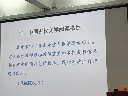 在讲座中,王勇教授向同学们推荐了中国古代文学阅读书目,如《中国语言文学系学生阅读书目·中国古代文学类》(修订本)和《高等学校中文专业阅读书目》(中国古代文学部分),另外,还给同学们分享了教育部及各高校推荐学习的古代文学电子资源。王勇教授详尽分析了当下市场上的古代文学学习资源,希望同学们能够择优阅读,珍惜时间,培养自己的文学素养。