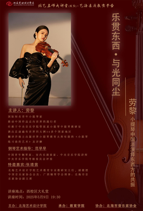 2025 年 5 月 9 日晚,北海艺术设计学院为深化美育教育实践、提升学生的艺术修养,特邀请到国际乐坛备受瞩目的中国小提琴演奏家、中央音乐学院管弦系劳黎老师,以 “乐贯东西・与光同尘” 为主题,用灵动的琴弦编织出跨越国界的艺术对话。北海艺术设计学院校长卢新华、副校长包建明、总督学王斌、纪委书记王照伟、教育学院院长熊秀峰、副院长蒙剑英等领导出席了本次活动。同时,本次活动受到了北海市文艺界与教育界的广泛关注,北海市音乐家协会主席林海等众多社会各界的音乐爱好人士莅临活动现场。